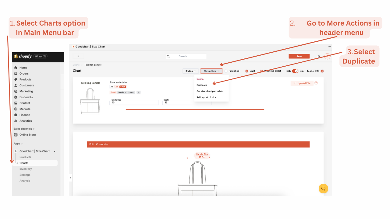 You can also Duplicate the size chart directly in the size chart header menu by selecting More actions button and Duplicate.