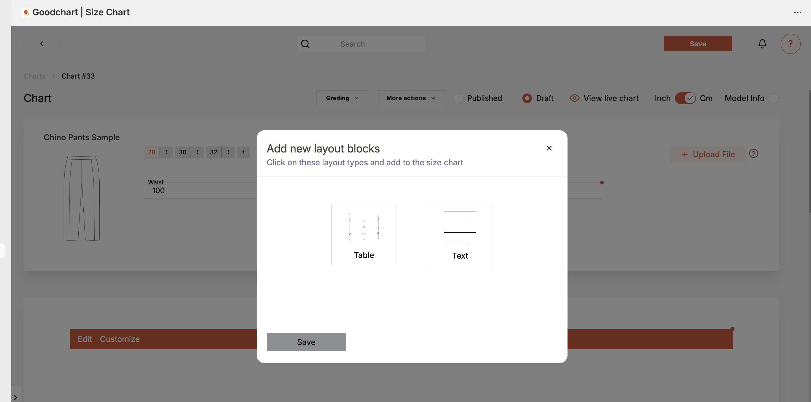 The Layout Block feature lets you add extra sections to your size chart for more flexibility and customization.