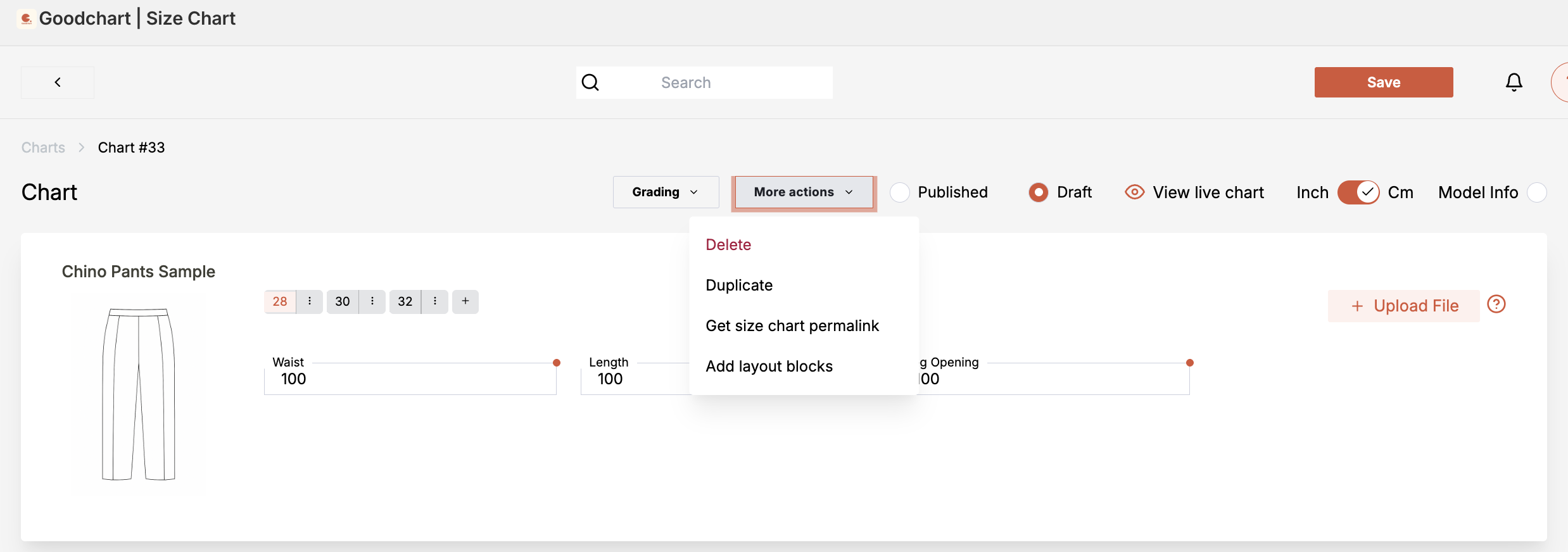 - While editing or creating a size chart, look for the "More Action" tab than scroll to “Add Layout Block” option.